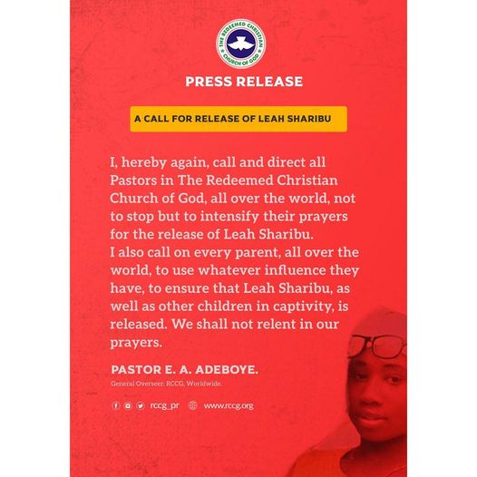 I, hereby again call and direct all pastors in the Redeemed Christian Church of God, all over the world, not to stop but to intensify their prayers for the release of Leah Sharibu.