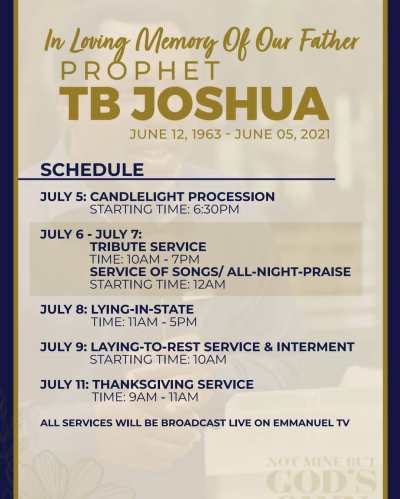 The Synagogue Church of All Nations has released detail for the funeral of its founder Prophet T.B. Joshua who died on June 5, Igbere TV reports.